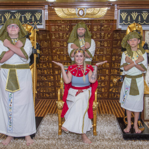Ein weiteres Highlight ist die Möglichkeit, traditionelle altägyptische Kostüme zu tragen und auf einem Thron im Stil von Tutanchamun zu sitzen. Diese besondere Kulisse bietet einzigartige Fotomomente für Familien, Paare und Gruppen.